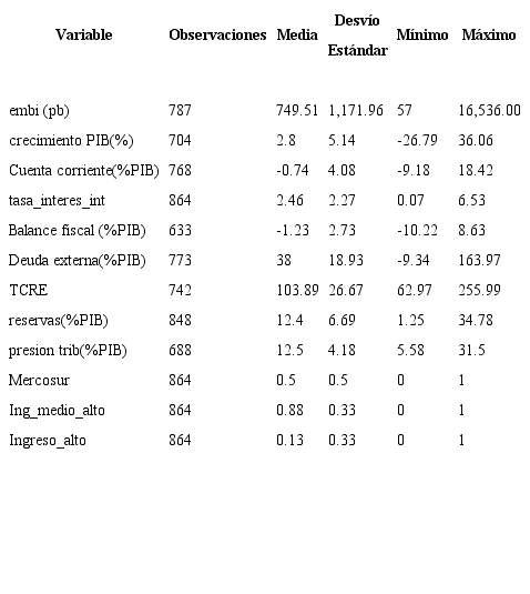 En cuanto a las variables a utilizar en el estudio, la variable dependiente o de resultado utilizada es el indicador del riesgo país, medido por el EMBIG (embi). El motivo de utilizar esta variable es que la misma se encuentra disponible para todas las economías y para la mayoría de los períodos considerados3.