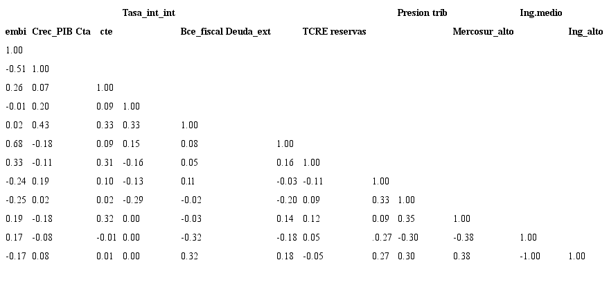 La matriz de correlación revela que el riesgo país se correlaciona de manera negativa con el crecimiento del PIB, el porcentaje de reservas internacionales, la presión tributaria y el nivel de ingreso alto de las economías (cuanto mayor es el nivel de ingreso de las economías menor es el riesgo país). Por otro lado, el tipo de cambio real, el balance fiscal, la deuda externa se correlacionan positivamente con el riesgo país, como así también si las economías son de ingreso medio alto y si el país forma parte del Mercosur.