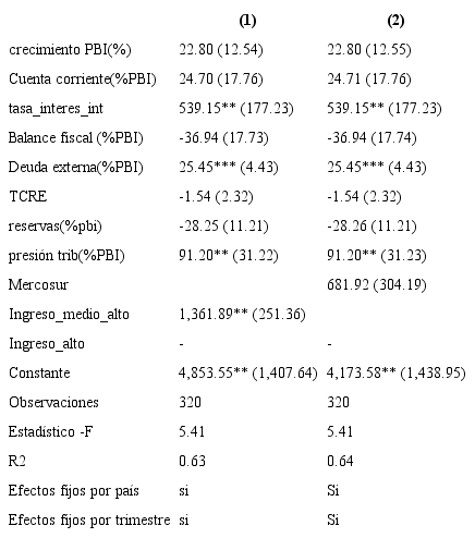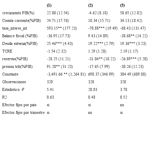 La elección de trabajar con datos de panel con efectos fijos se realizó sobre la base de estudios previos de la literatura relacionada. Los efectos fijos de trimestre y país controlan por factores comunes a un período (se utilizan datos trimestrales) o país, más allá de las variables domésticas que cambian período a período. En función con la disponibilidad de datos se estimó el modelo base controlando por efectos fijos por país y por periodo, por país y luego se controló por efecto fijos de período (columnas 1, 2 y 3 respectivamente en la tabla 3).