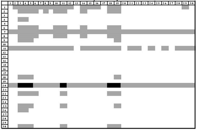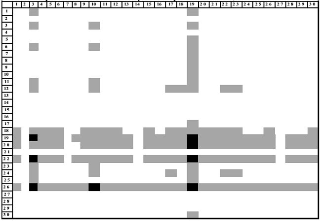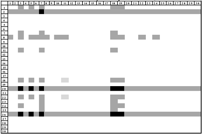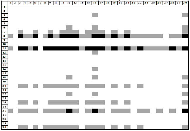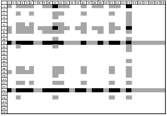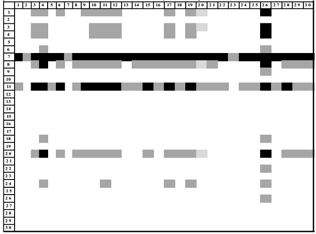 Dada la expresión anterior, se establece que la matriz intensidad de primer orden (INT1) coincide con la MPM. Cabe mencionar que el estudio empírico realizado se basa en la visualización de los campos de influencia, graficados con los resultados de la MPM visto como un mapa en el que aparece una matriz con tres tipos de coeficientes: aquellos campos de influencia que tienen un fuerte impacto sobre el sistema, es decir, que tienen los valores más altos, por arriba del 20 por ciento aparecen de color negro; en color gris son los campos de influencia con altos valores pero de menor magnitud que los anteriores y, finalmente, los coeficientes con bajo impacto sobre el sistema o campos de influencia con valores inferiores están en color blanco. Como es lógico, aquellos sectores que poseen mayor cantidad de secuencias de color negro y gris son industrias con un alto potencial de impactar a la economía en la medida en que establecen altas interrelaciones con el resto de las actividades productivas.