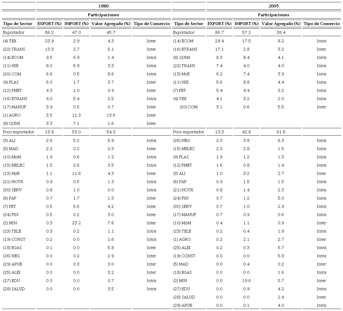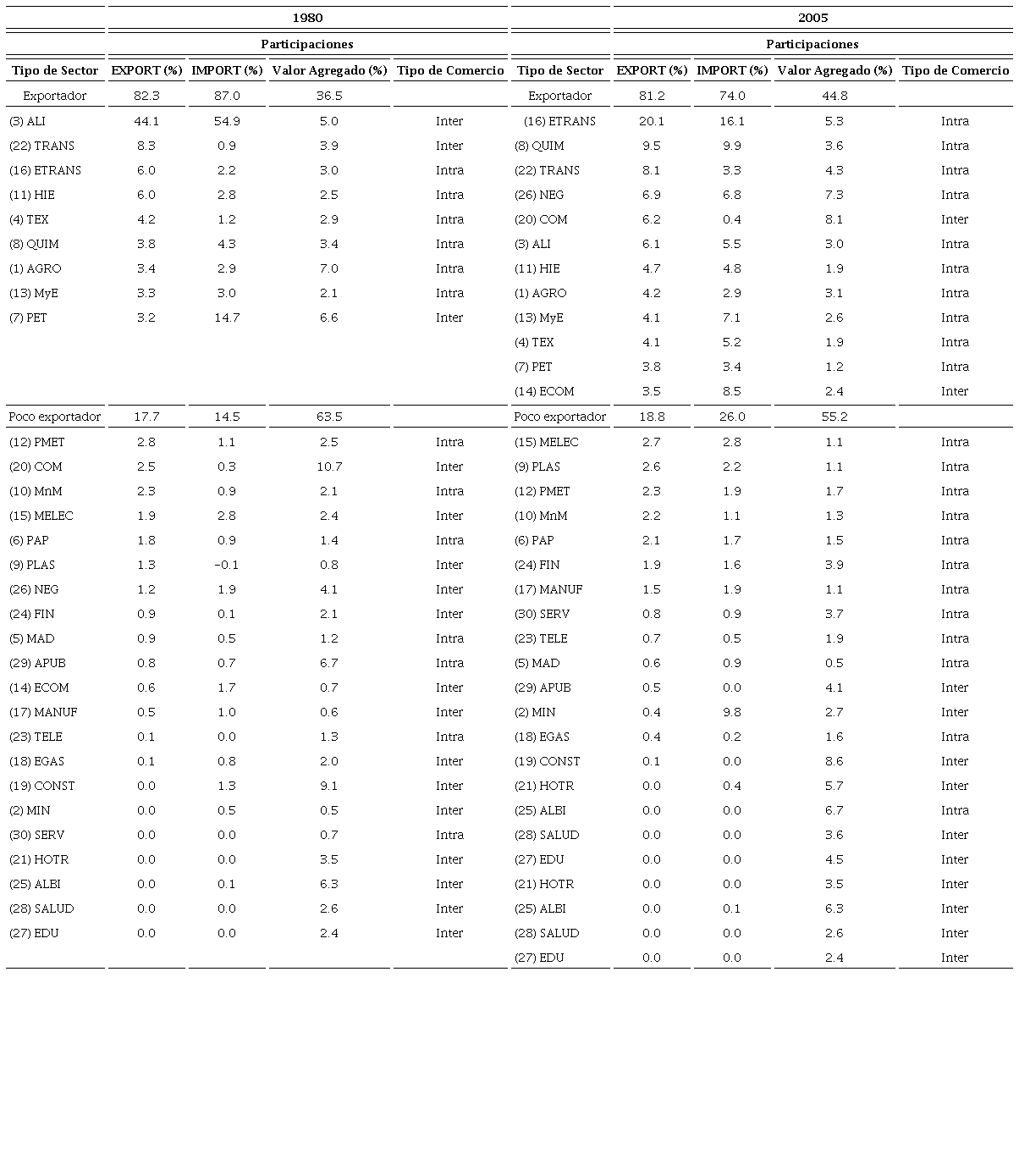 La información que deriva del Cuadro 1, conduce a reflexionar sobre tres ideas: En primer lugar, en Corea del Sur - a excepción de los sectores (14) Equipo de cómputo y (16) Automotriz, que concentran aproximadamente el 40% de las ventas al exterior - existe cierta equidistribución en la contribución de las distintas actividades en las exportaciones y valor agregado. Segundo, la mayor especialización de actividades de alta tecnología, se consolida en el tiempo; por lo menos desde 1980 las ramas Química, Equipo de cómputo y Automotriz participaban en el comercio coreano con el exterior. Tercero, si bien, el peso de las ramas más exportadoras en las ventas internacionales es semejante en ambos años (86% de las exportaciones), se da un mayor grado de internacionalización de dichas industrias, un aumento de 10 puntos en las importaciones y una disminución de 7 unidades en la participación en valor agregado. Es decir, existe una cierta ruptura de cadenas productivas nacionales de las ramas más exportadoras, que es compensada con el incremento en las compras provenientes del exterior, probablemente resultado de un esquema de producción internacional fragmentado.