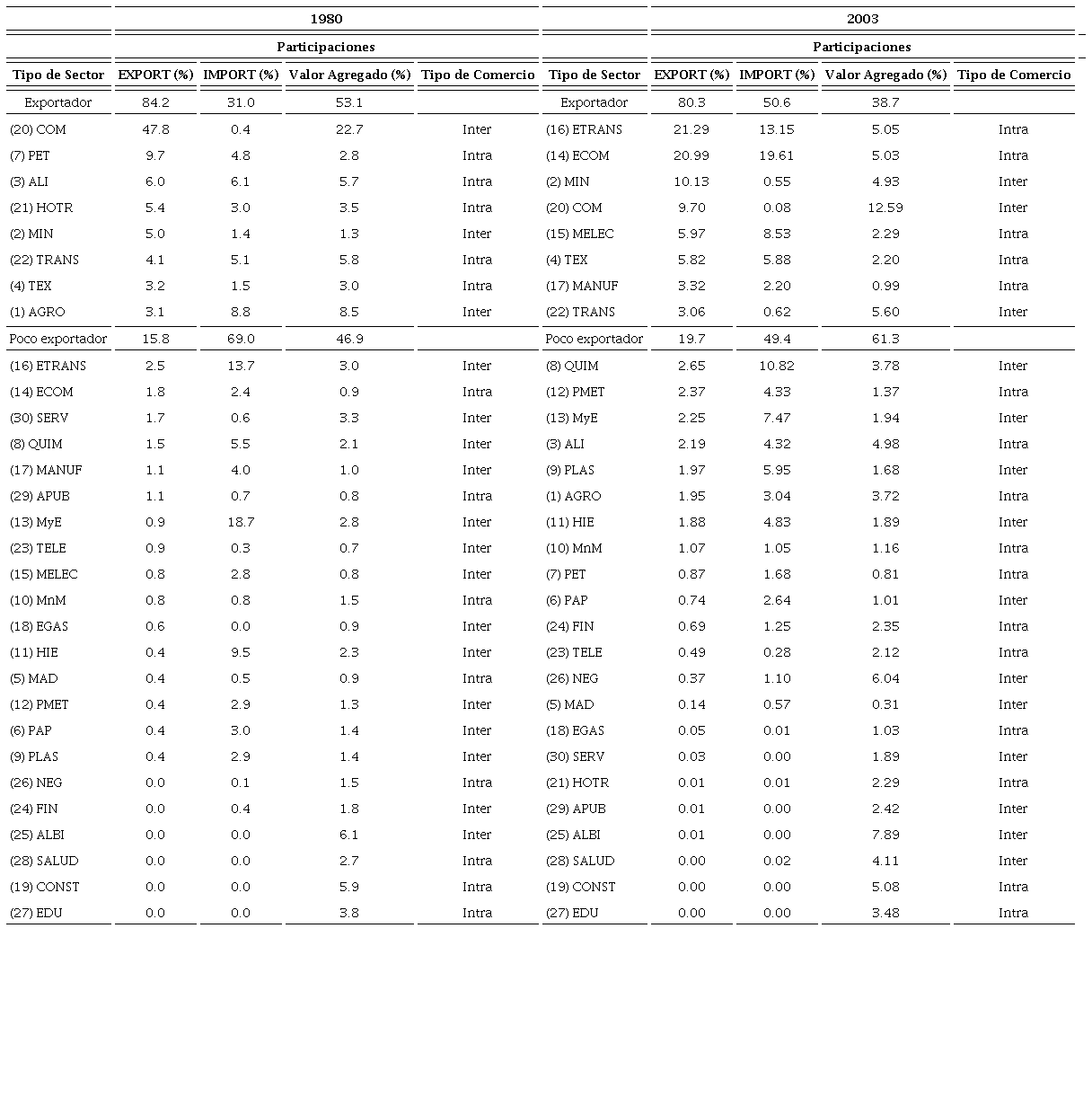 Los cambios en el rumbo de la política económica se reflejan en el tipo de especialización comercial, de las tres economías estudiadas, México es la que presenta la mayor transformación en el patrón de especialización comercial, de industrias de BT y MT, relativamente articuladas, para el año 2003 serán tres ramas de elevada intensidad tecnológica, las que concentran el 48% de las exportaciones y más del 50% de las importaciones -(14) Equipo de cómputo, (15) Maquinaria eléctrica y (16) Vehículos de motor - las cuales son representativas de prácticas de fragmentación productiva y, por lo mismo, su grado de articulación con el interior de la estructura productiva es realmente bajo.