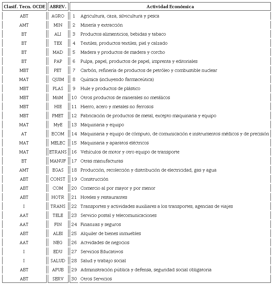 Las bases de datos empleadas provienen de distintas fuentes de información. Las matrices insumo-producto (MIP) de 1980 fueron publicadas por el Instituto Nacional de Estadística (INE) de España, el Banco de Corea y el Instituto Nacional de Estadística, Geografía e Informática (INEGI) de México. Las MIP del segundo periodo derivan del STAN Structural Analysis Database (OCDE), 2003 para México y 2005 para España y Corea. Por provenir de diferentes fuentes, la información no es directamente compatible, lo que requirió homologar y agregar las distintas matrices a 30 sectores. Como una de las inquietudes del estudio es comparar las características de las estructuras productivas en dos períodos caracterizados por diferentes modelos de desarrollo, y debido a cambios en el nivel de agregación de las MIP de la OCDE, el último año homologable con las matrices de 1980 correspondían a la primera mitad del decenio de 2000. Finalmente, para definir el potencial de desarrollo de cada economía se especifica el tipo de especialización tecnológica que presentan las actividades con mayor capacidad de generar efectos multiplicadores. Para ello se retoma la clasificación tecnológica de la OCDE presentada en el Anexo.