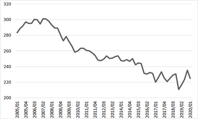 Como consecuencia de lo anterior, se decidió construir una variable aproximada para el salario nominal a partir la información también publicada en la ENOE. Esta encuesta señala qué porcentaje de la población ocupada gana hasta un salario mínimo (SM), más de 1 y hasta 2 SM, más de 2 y hasta 3 SM, más de 3 y hasta 5 SM y más de 5 SM. Sin embargo, el propio diseño de la encuesta no permite obtener directamente cuál es el ingreso promedio de los trabajadores ubicados en cada uno de los cinco rangos. Por lo tanto, se hizo el supuesto de que en el primer rango se gana 1.0 SM, en el segundo rango 1.5 SM, en el tercer rango 2.5 SM, en el cuarto rango 4.0 SM y en el rango más alto 11.0 SM. En el primer rango se supuso 1.0 SM porque es lo menos que debiera recibir un trabajador de acuerdo con el marco legal. En los tres rangos de ingreso siguientes se supuso el valor medio de los límites de los rangos y en el último rango se escogieron 11.0 SM. De esta manera, se puede ponderar el número de salarios mínimos que se han supuesto, por el porcentaje de la población ocupada que se ubica en cada rango de ingreso. Este promedio ponderado se traduce en una variable aproximada para el salario real al ser dividido entre el Índice Nacional de Precios al Productor (INPP)5. En la Gráfica 1 se refleja la evolución de la variable aproximada para el salario real. Jiménez-Gómez et al., (2020) utilizaron esta variable aproximada para intentar pronosticar el impacto de la contracción del PIB sobre el número de trabajadores permanentes afiliados al IMSS para el 2020.