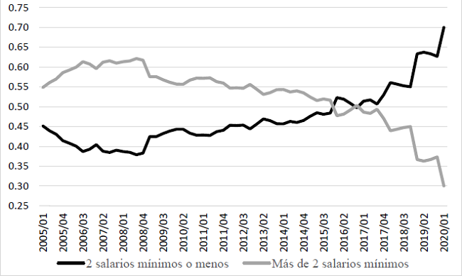 Los incrementos en el SM otorgados a partir de 2019 han evitado que se siga deteriorando la variable aproximada para el salario real, pero han provocado que el porcentaje de la población ocupada que gana 2 SM o menos siga aumentando. De hecho, este porcentaje alcanzó el 70% en el primer trimestre de 2020. La contraparte es que el porcentaje de la población ocupada que gana más de 2 SM ha disminuido sistemáticamente. De esta manera, los cambios en los porcentajes de la población ocupada que se ubican en cada uno de los 5 rangos de ingreso determinan en gran medida la evolución de la variable aproximada para el salario real en el periodo de la muestra.