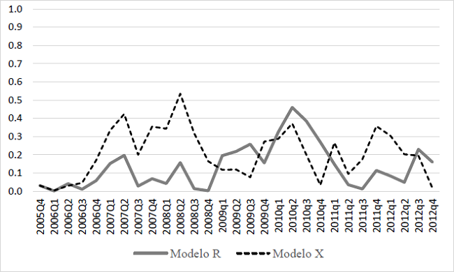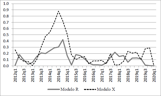 Bajo la hipótesis de parámetros constantes, el valor crítico es 1.36 al 95 por ciento de confianza. Sí el estadístico de prueba corregido por el sesgo se divide entre 1.36, el nuevo valor de referencia para rechazar la hipótesis nula es 1.0. El periodo base de esta prueba inicia en el primer trimestre de 2005 y termina el cuarto trimestre de 2011 y el estadístico se obtiene agregando un trimestre a la vez hasta cubrir la muestra completa. De esta manera, la Gráfica 3 describe la trayectoria del cuando corre del primer trimestre de 2012 al primer trimestre de 2020 tanto para la forma X como para la forma R del modelo. Como ninguno de los valores de se ubica por arriba de 1, no se rechaza la hipótesis nula de la constancia de los parámetros.