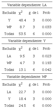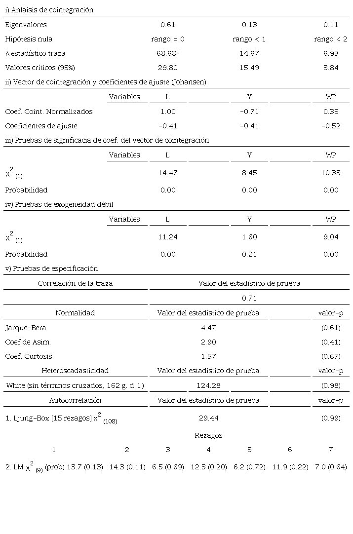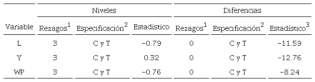 En el Cuadro 1 se reportan los resultados de las pruebas para detectar si de las variables L, Y y WP son integradas de orden 1 (I(1)).