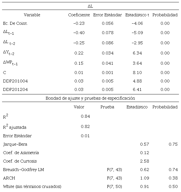 En este modelo de corrección del error, hay una retroalimentación de las tres variables en el crecimiento del empleo, ya que las diferencias de las variables de empleo con 1 y 2 rezagos, de producción con 2 rezagos y de salario real con 1 rezago resultaron ser estadísticamente significativas. Por otra parte, la constante estimada es positiva y estadísticamente significativa, aunque su valor es relativamente pequeño. Las variables dicotómicas permanentes (en diferencias) para los cuartos trimestres de 2010 y 2012 fueron estadísticamente significativas, ambas con coeficientes estimados positivos.