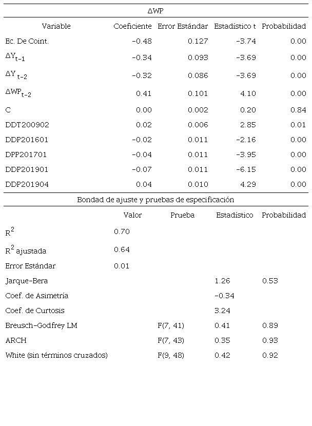 En este modelo se incluyó una constante a pesar de no ser significativa. Se introdujeron 4 variables dicotómicas permanentes (en diferencias) por choques que afectaron a la variable aproximada del salario nominal en los primeros trimestres de 2016 y 2019, así como en el cuarto trimestre de este último año. También se consideró una variable dicotómica permanente por el aumento en el precio de los combustibles en enero de 2017, que afectó a la inflación en el primer trimestre de ese mismo año. De la misma forma se incorporó una variable dicotómica transitoria en el segundo trimestre de 2009 para cumplir con el supuesto de normalidad en la variable de producción, pero que resultó ser significativa también para el salario real.