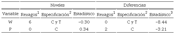 Las pruebas de los órdenes de integración de las variables W y P se reportan en el Cuadro A1, que revela que pueden ser consideradas como I(1).