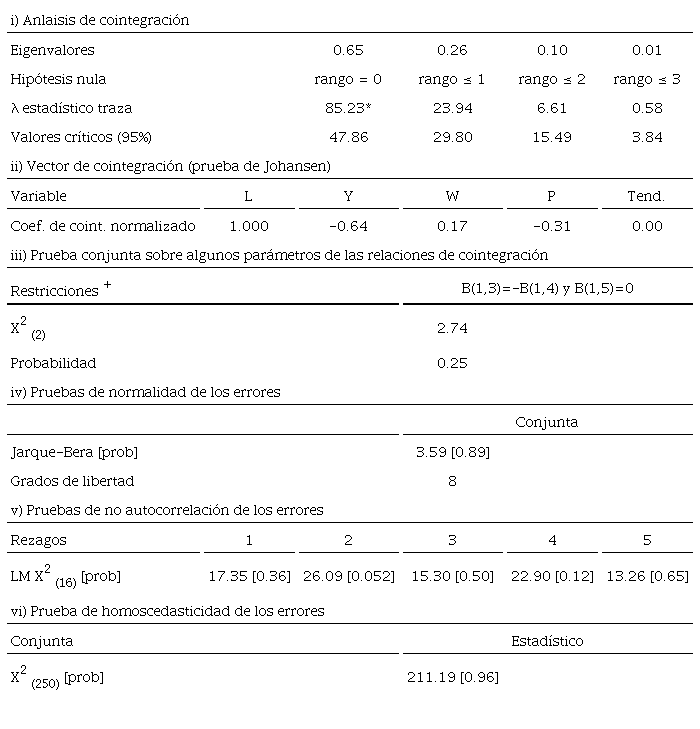 Para realizar los ejercicios estadísticos se obtuvieron los logaritmos naturales de todas las variables a utilizar en este estudio y se utilizó el programa estadístico E-views. Primero se estimó un modelo VAR con 4 variables (L, Y, W y P) y una tendencia determinística en el espacio de cointegración con el propósito de probar una hipótesis nula: la igualdad entre el coeficiente del salario nominal y el negativo del coeficiente del nivel de precios y que el coeficiente de la tendencia determinística fuera igual a cero de manera conjunta. Los resultados de la prueba revelaron que la hipótesis nula no se puede rechazar, por lo que se estima una ecuación de demanda de trabajo con el salario real (WP) sin pérdida de información y sin una tendencia determinística lineal en el espacio de cointegración. Los resultados de este ejercicio preliminar son reportados en el Apéndice.