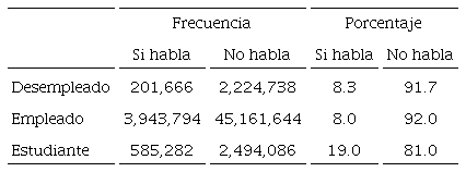 La Tabla 1 describe el porcentaje y cantidad de hablantes de inglés según la situación laboral, en ella se observa que, tanto entre personas empleadas y desempleadas, cerca del 8% hablan inglés. Por su parte, la población estudiantil presenta el porcentaje más elevado de hablantes de lengua inglesa, con un 19%. Este resultado se asocia con mejores expectativas de movilidad social para dichos individuos.