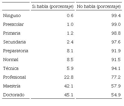 Posteriormente se evalúa el nivel de inglés por escolaridad (Tabla 2). El resultado muestra que el 22% de los egresados de licenciatura hablan inglés, cifra que se duplica para quienes concluyeron un posgrado.