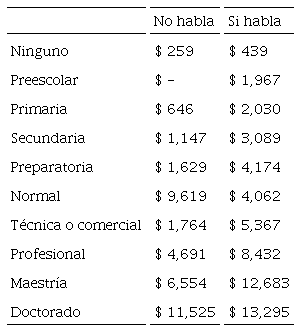 En la Tabla 3 se representan los ingresos laborales mensuales a partir de los distintos niveles de escolaridad3. Se observa que aquellos con formación técnica y hablantes de lengua inglesa reportan ingresos del triple de aquellos que no dominan el idioma. Para dichos trabajadores el impacto salarial es crucial. Hablar inglés simplifica la integración a empresas trasnacionales. Un tema que resulta de suma relevancia es que, en promedio, los técnicos que hablan inglés, tienen ingresos superiores que los egresados de licenciatura que no lo hablan.