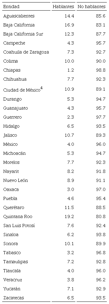 En la Tabla 5 se muestra el porcentaje de la población que habla inglés, por entidad federativa. Se puede observar que Quintana Roo, Baja California y Aguascalientes, son los tres estados que tienen un porcentaje mayor de personas angloparlantes, con 19.2, 16.9 y 14.4 por ciento, respectivamente, de sus habitantes. Tal situación se explica por el carácter turístico e industrial de los estados mencionados.