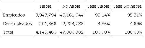 La Tabla 6 muestra la tasa de desempleo que viven los angloparlantes. En ella se puede apreciar que los valores son muy semejantes tanto para hablantes como no hablantes de lengua inglesa. Los datos sugieren que dominar el segundo idioma, no necesariamente incrementa las probabilidades de encontrar empleo con rapidez. Sin embargo, es destacable que al encontrar trabajo los angloparlantes cuentan con tasas salariales significativamente más elevadas (como se vio en la Tabla 3, que compara los distintos niveles de ingreso según dominio del inglés y nivel educativo).