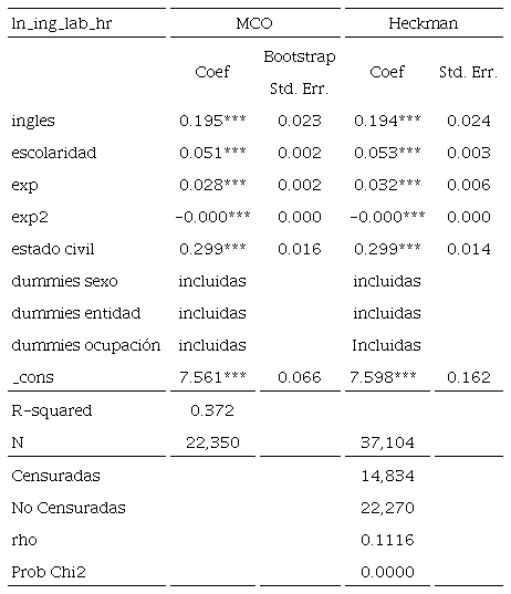 A partir de la Tabla 7 es posible observar que, al controlar el sesgo de selección, los individuos que hablan inglés obtienen en promedio un premio salarial de 19.4%, lo cual, demuestra la importancia del idioma inglés como un elemento de calificación laboral, que tiene efectos positivos en el salario. Por lo tanto, las personas que hablan este idioma en México obtienen un mayor salario que quienes no lo hablan. Por su parte, los demás coeficientes exhiben valores acordes a lo señalado en investigaciones previas, que realizan este tipo de ecuaciones referente a la determinación salarial.