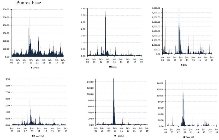 Las variables financieras utilizadas son: los tipos de cambio locales de cada país contra el dólar americano, las primas de seguro de protección contra incumplimiento en dólares o los Credit Default Swaps (CDS) a 5 años, sus principales índices accionarios y las tasas de interés a 1, 5 y 10 años, en el período 2003-2019.