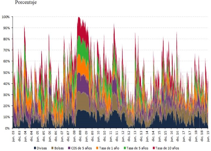 Para la construcción del índice de estrés financiero para cada una de las varianzas calculadas por medio del GARCH [1,1], se calcula su percentil utilizando en la muestra datos de 2003 a 2019. El percentil nivel 100 identifica el momento en el cual la volatilidad ha sido la más elevada del mercado en cuestión, y un percentil de cero identifica cuando la volatilidad ha sido la más baja durante el periodo. Por último, se promedian aritméticamente los percentiles de cada mercado para la construcción del índice, asignando la misma ponderación a cada uno de los mercados.