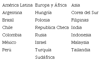 Se utilizaron las series de 19 economías emergentes de América Latina, Europa y África, y Asia emergente. Al seleccionar los 19 países emergentes se consideró que tuvieran un mercado financiero relativamente desarrollado y que su política cambiaria fuera de libre flotación, aunque como es claro, el grado de convertibilidad y de flotación puede diferir entre las economías.