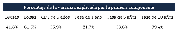 En el análisis que se presenta únicamente se considera la primera componente para cada activo de los países emergentes, con el objetivo de considerar el factor que caracteriza a los mercados emergentes. Se eliminan los factores de índole idiosincrático o regional, sin descartar aquellos eventos locales de impacto “contagio” del comportamiento de otros activos de otros países.