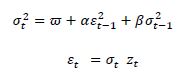 Donde el parámetro es la reacción del mercado, y el parámetro es la persistencia de la volatilidad. La suma de ambos parámetros debe ser menor que uno para garantizar la convergencia de los pronósticos de volatilidad a diferentes plazos. es una constante, es la desviación estándar de la variable analizada y es una variable aleatoria con distribución normal estándar (Mota y Núñez 2015).