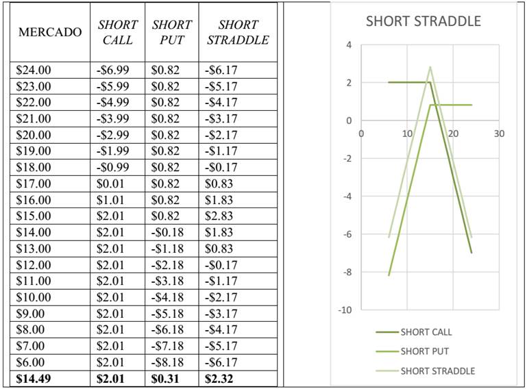 En la Gráfica 3 se aprecia el estado de resultados para la elaboración de la estrategia SHORT STRADDLE para AMX-L del sector servicios de telecomunicaciones, la cual al inicio del contrato (31/12/2019) el subyacente tenía un valor inicial de $15.1 y al final del contrato (31/12/2020) de $14.49 (marcado en negritas).