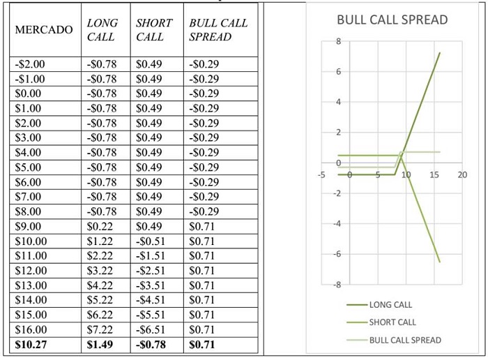 En la Gráfica 4 se aprecia el estado de resultados para la elaboración de la estrategia BULL CALL SPREAD para CEMEX-CPO del sector minerales no metálicos, la cual al inicio del contrato (31/12/2019) el subyacente tenía un valor inicial de $7.08 y al final del contrato (31/12/2020) de $10.27 (marcado en negritas).