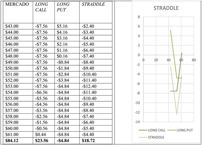 Si se compran tanto un put como un call, ambos con el mismo precio de ejercicio, se requiere un desembolso relativamente considerable al inicio, la suma de ambas primas, pero se obtiene una estrategia singularmente conveniente: se gana tanto al alza como a la baja, siempre y cuando el desplazamiento observado en el mercado sea considerable (cambios drásticos en el precio del activo subyacente).