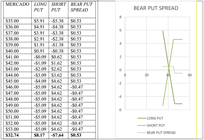 En la Gráfica 6 se aprecia el estado de resultados para la elaboración de la estrategia BEAR PUT SPREAD para TLEVISA-CPO del sector servicios de telecomunicaciones, la cual al inicio del contrato (31/12/2019) el subyacente tenía un valor inicial de $44.37 y al final del contrato (31/12/2020) de $32.74 (marcado en negritas).