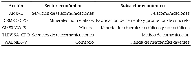 En el Cuadro 1 se observa que la distribución de las acciones estudiadas en esta investigación por sector económico es la siguiente: Servicios de telecomunicaciones (2), Minerales no metálicos (1), Minería (1) y Comercio (1).