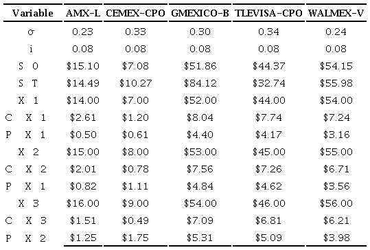 En esta investigación se analizaron 50 estrategias de cobertura de riesgos para las principales opciones financieras americanas sobre acciones (AMX-L, CEMEX-CPO, GMEXICO-B, TLEVISA-CPO y WALMEX-V) del MexDer, se trabajó con la tasa de interés nacional libre de riesgo TIIE en base a la información publicada por Banxico, la volatilidad es histórica anual extraída del vector de precios. En cuanto a la periodicidad si bien MexDer estipula que estos tipos de contratos pueden comercializarse cada 3 meses hasta un año, en este estudio, con base en el mercado se considera periodicidad anual; el periodo de valuación de cada opción financiera americana corresponde del 31/12/2019 al 31/12/2020 o bien el primer año desde la llegada del COVID-19 al mundo. A continuación, se muestra su clasificación por sector y subsector económico y los valores usados en cada variable para la obtención de los resultados para cada opción financiera americana analizada.