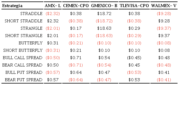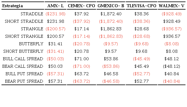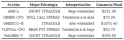 El Cuadro 2 muestra los valores de entrada para la conformación de las estrategias con opciones americanas sobre cada tipo de acción; mientras que los Cuadros 3 y 4 reflejan las pérdidas o ganancias de forma individual o por lote de opciones, respectivamente. AMX-L tuvo poca variación por lo que su mayor ganancia la obtuvo con el SHORT STRADDLE, CEMEX-CPO tuvo una tendencia al alza teniendo la mayor ganancia con el BULL CALL SPREAD, GMEXICO-B tuvo alta volatilidad alcista reflejando su mayor ganancia mediante el STRADDLE, TLEVISA-CPO muestra tendencia a la baja con mayor ganancia mediante el BEAR PUT SPREAD. Por último, se observa que WALMEX-V presentó baja volatilidad obteniendo la mejor ganancia con el SHORT STRANGLE.