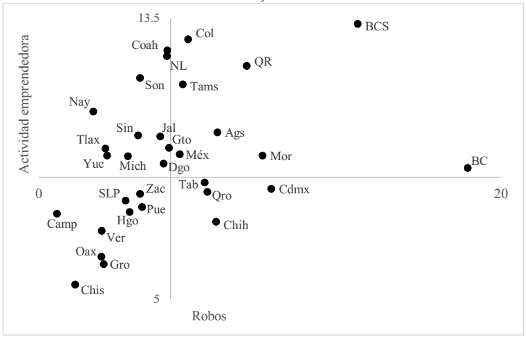 En un sentido contrario, la relación positiva se presenta en el cuadrante superior derecho de la Gráfica 1, con las entidades de Aguascalientes, Baja California, Baja California Sur, Colima, México, Morelos, Quintana Roo y Tamaulipas. Dichas entidades mostraron una iniciativa emprendedora y una tasa de robos mayor al promedio del país. Asimismo, 9 estados evidenciaron una relación directa entre las variables del análisis, pues presentan una actividad emprendedora y tasa de robos menor a la media de la nación.