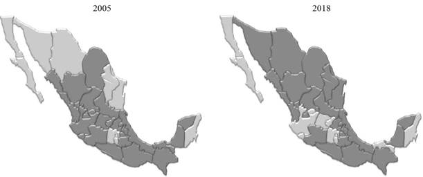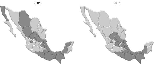 De manera preliminar al ejercicio econométrico, se analiza la actividad emprendedora en las entidades federativas de México para los años 2005 y 2018. La Figura 1 muestra para ambos años los estados en color oscuro como aquéllos con una tasa de actividad emprendedora menor a la media nacional, que para 2005 fue de 10.04 y para 2018 fue de 8.32; mientras que en color claro aquéllos con una tasa de actividad emprendedora mayor a la media nacional. En el año 2005, 14 de 32 entidades mexicanas obtuvieron menos de 10 emprendimientos por cada 100 trabajadores independientes. En este sentido, los estados pertenecientes a las regiones centro-norte, oriente y sur del país presentaron menor dinamismo emprendedor, mientras que las entidades con mayor nivel de emprendimiento se ubicaron en el norte, centro y occidente del territorio nacional. Para el año 2018, 12 de 32 entidades alcanzaron menos de 8.32 emprendimientos por cada 100 trabajadores independientes, principalmente ubicados en las regiones centro-norte, oriente y sur del país. Caso contrario se presentó en las regiones del norte, noroeste, occidente y centro quienes ostentaron una actividad emprendedora mayor a la media nacional y, por lo tanto, mayor dinamismo emprendedor.