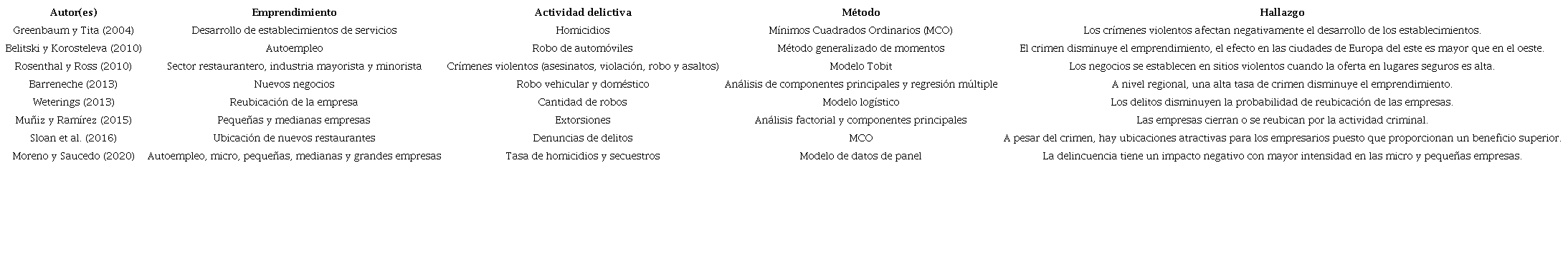 Igualmente, en el trabajo de Sloan et al. (2016) se estudian los efectos del crimen en la decisión de ubicación de los emprendimientos restauranteros. Los autores utilizan información histórica de localización de delitos y aperturas de restaurantes y conjuntan extensiones territoriales para elaborar vecindarios de Memphis, además de incluir en su modelo variables dummy como densidad poblacional, ingreso y educación de estas vecindades. A través de una estimación de MCO, encuentran que los delitos no disminuyen el emprendimiento restaurantero y concluyen que estas zonas presentan un beneficio sumamente atractivo a los empresarios a pesar de los crímenes violentos.