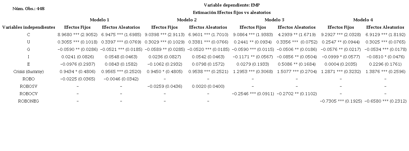 Se aprecia que solo en los modelos 3 y 4 las variables de ROBOCV y ROBONEG resultaron estadísticamente significativas y con el signo esperado. En términos cuantitativos se puede establecer que ante un incremento de un punto porcentual en la tasa de robos con violencia se reduce la actividad emprendedora en 0.2546 puntos porcentuales, mientras que ante un incremento de un punto porcentual en la tasa de robos a negocios se reduce en mayor medida la actividad emprendedora, en 0.7305 puntos porcentuales.