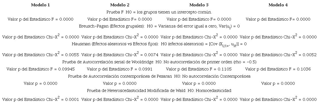 La prueba de Breusch y Pagan (1980) evalúa si el modelo corresponde a una especificación de efectos aleatorios o de datos agrupados en cuyo caso la H0 indica que la varianza del error no cambia, esto es: . De no rechazarse la H0, la estructura de panel de efectos aleatorios no aporta información. Finalmente, la prueba de Hausman (1978) evalúa si la mejor especificación del modelo es con efectos aleatorios o fijos. La H0 del estadístico indica que los estimadores de Mínimos Cuadrados Generalizados (MCG) son consistentes, pues . Si la H0 de la prueba de Hausman no se rechaza, entonces la mejor especificación es un modelo de panel con efectos aleatorios.