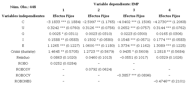 En lo que respecta a la variable desempleo (U), se aprecia que para las cuatro regresiones resultó estadísticamente significativa y con signo positivo, lo cual indica que, ante una situación de desempleo, el emprender un negocio resulta una opción de ingreso por parte de las personas. En las regresiones 3 y 4, los coeficientes sugieren que el desempleo aumenta el emprendimiento en 0.2441 y 0.2547 puntos porcentuales respectivamente.