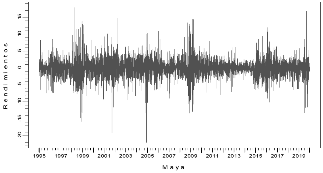 Para el análisis del riesgo extremo en el mercado del petróleo de baja calidad. El estudio utiliza los precios diarios del crudo Maya3 del periodo del 2 de enero de 1995 al 31 de diciembre de 2019, totalizando 6,459 observaciones. Las series se obtuvieron de la base de datos de Bloomberg y la selección de la muestra fue de acuerdo con la disponibilidad de los datos. Debido al hecho de que los precios del petróleo se caracterizan por ser series no estacionarias, para fines del estudio es importante transformar los precios a series estacionarias, esto es, el cálculo de los rendimientos continuos a través de los cambios logarítmicos de los precios de cierre de dos días consecutivos de operación.
