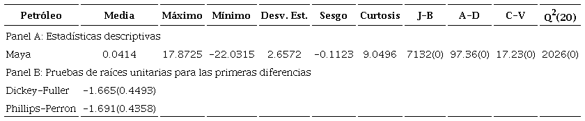 En el Panel A de la Tabla 1 se reporta las estadísticas básicas de los rendimientos del petróleo tipo Maya. El rendimiento promedio es positivo, pero relativamente pequeño en comparación con la desviación estándar. Este hecho indica una relación rendimiento-riesgo positiva y una mayor exposición al riesgo para los participantes en el mercado del petróleo Maya. La serie de los rendimientos está sesgada a la izquierda y presenta exceso de curtosis para el periodo de análisis, esto es, propiedades de colas más anchas y largas que la distribución normal. El signo negativo en el coeficiente sesgo revela que los rendimientos extremos negativos suelen ocurrir más frecuentemente que los rendimientos extremos positivos. El valor del estadístico Jarque-Bera es muy alto y su valor-p igual a cero, lo que indica que los rendimientos diarios no siguen una distribución normal. Este resultado también es sustentado por las pruebas de Anderson-Darling y Cramer-Von Mises.