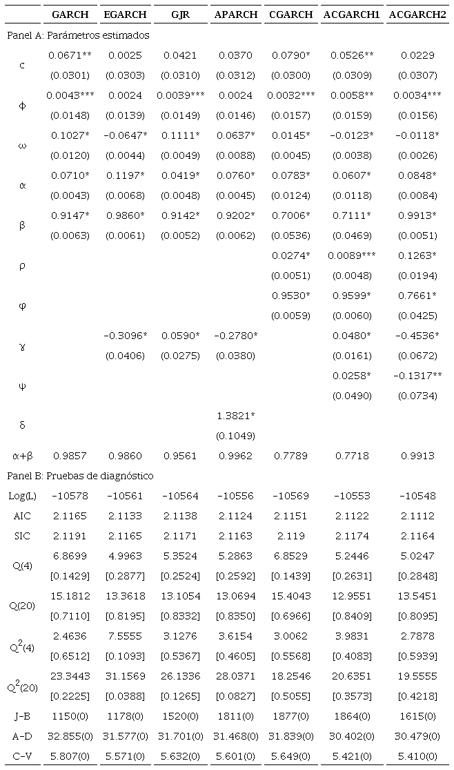 Debido a la fuerte presencia de dependencia no-lineal y heterocedasticidad en la serie de los rendimientos del petróleo Maya, en este estudio se estiman una familia de modelos GARCH convencionales y modelos CGARCH simétrico y asimétricos discutidos en la sección anterior. La Tabla 2 reporta los resultados de los parámetros estimados de las 7 estructuras GARCH y CGARCH, así como las pruebas de diagnóstico sobre los residuales estandarizados simples y cuadrados para el petróleo Maya. Los estimadores de µ que corresponden a la especificación de la media condicional, no son estadísticamente significativos, excepto en los modelos GARCH, CGARCH y ACGARCH1, mientras que la mayoría de los coeficientes del término AR (1) son positivos y significativos a un nivel de 10%. El criterio de Hanna-Quinn es utilizado para determinar el número de rezagos óptimo en la ecuación de la media condicional. Debido al hecho de que los criterios de información tradicionales de Akaike y Schwarz tienden a sobreestimar y subestimar el orden de rezagos y reducen el poder de la prueba de acuerdo con el estudio de simulación de Liew (2004).