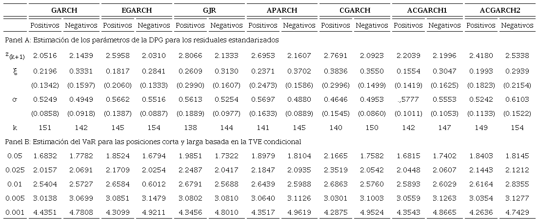 De acuerdo con Embrechts et al. (1997), el parámetro mide la velocidad de convergencia a cero de la cola de la distribución. Para , la DPG toma la forma de la distribución de Pareto ordinaria, es decir, de colas más anchas. Cuando y , la DPG tiene la forma de las distribuciones exponencial y Pareto de tipo II, respectivamente. Aunque varios estudios han confirmado el potencial de la DPG para el modelado de las colas de la distribución de rendimientos. Sin embargo, los datos empíricos presentan las características comunes de heterocedasticidad y fuerte dependencia observada en las series de los rendimientos (McNeil y Frey, 2000).
