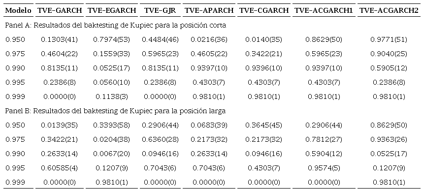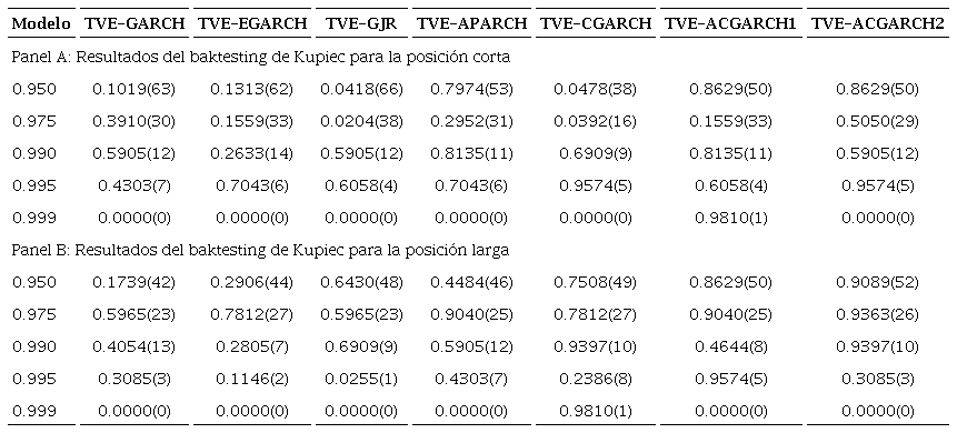 Para las predicciones fuera de la muestra de la posición larga, la aproximación TVE-ACGARCH2 proporciona el mejor desempeño predictivo en la estimación del VaR para los niveles de confianza del 95% y 97.5%, seguido por la aproximación TVE-ACGARCH1 al observar 50 y 25 fallos empíricos contra 52 y 26 fallos empíricos, respectivamente. Los resultados de los valores-p del estadístico de Kupiec revelan el poder predictivo de los modelos TVE-CGARCH y TVE-ACGARCH2 en la estimación del VaR para el nivel de confianza del 99%, mientras que la aproximación TVE-ACGARCH1 proporcionan el mejor desempeño predictivo fuera de la muestra en el nivel de confianza del 99.5%, al observar exactamente 5 fallos empíricos. Para el caso del 99.9%, el desempeño predictivo de la aproximación TVE-CGARCH supera notablemente a todos los demás modelos VaR comparados, debido a que el número de fallos empíricos es igual al número de fallos esperados.