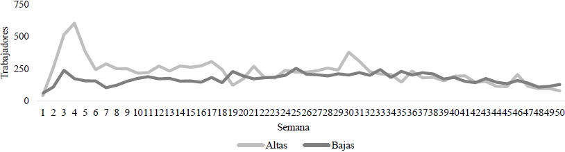 La Gráfica 1 muestra el comportamiento del personal, en materia de altas y bajas, al interior de la empresa bajo estudio durante el periodo considerado (2019). En las primeras 5 semanas del citado año, los resultados muestran un crecimiento significativo en el número de altas, asociado a la promoción de vacantes por parte de la maquiladora, así como la fluctuación del mercado laboral al iniciar el año natural. Posteriormente, la contratación se estabiliza y, desde el segundo cuatrimestre del año (semana 20) hasta el cierre de este (semana 50), el número de bajas presenta cifras muy similares al número de altas, es decir, la empresa muestra una fluctuación semanal aproximada de 400 trabajadores, en donde alrededor del 50% terminan su relación de trabajo (por renuncia: 94.12%; despido: 5.75%; o defunción: 0.13%) y el resto se integra por personal de nuevo ingreso.