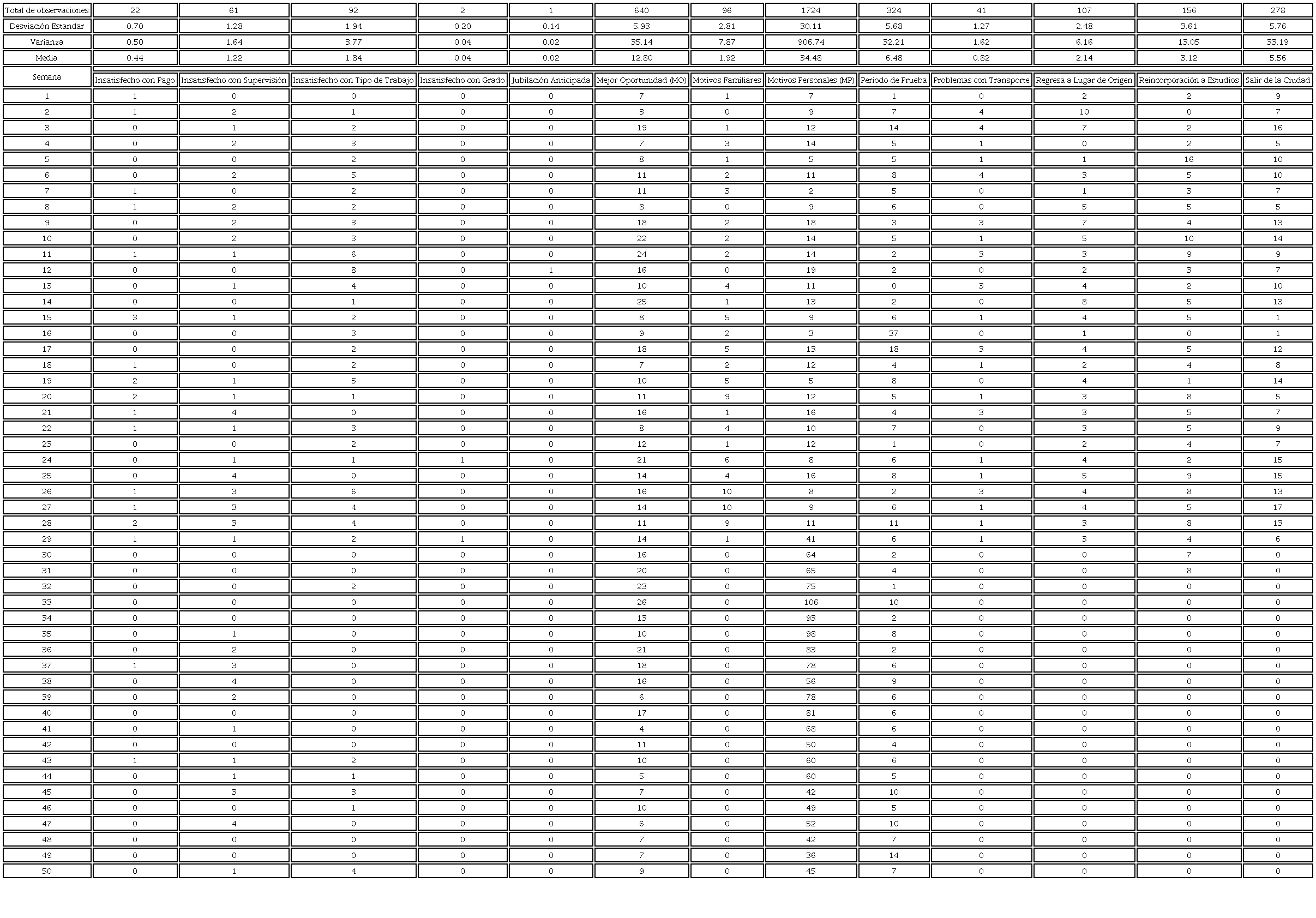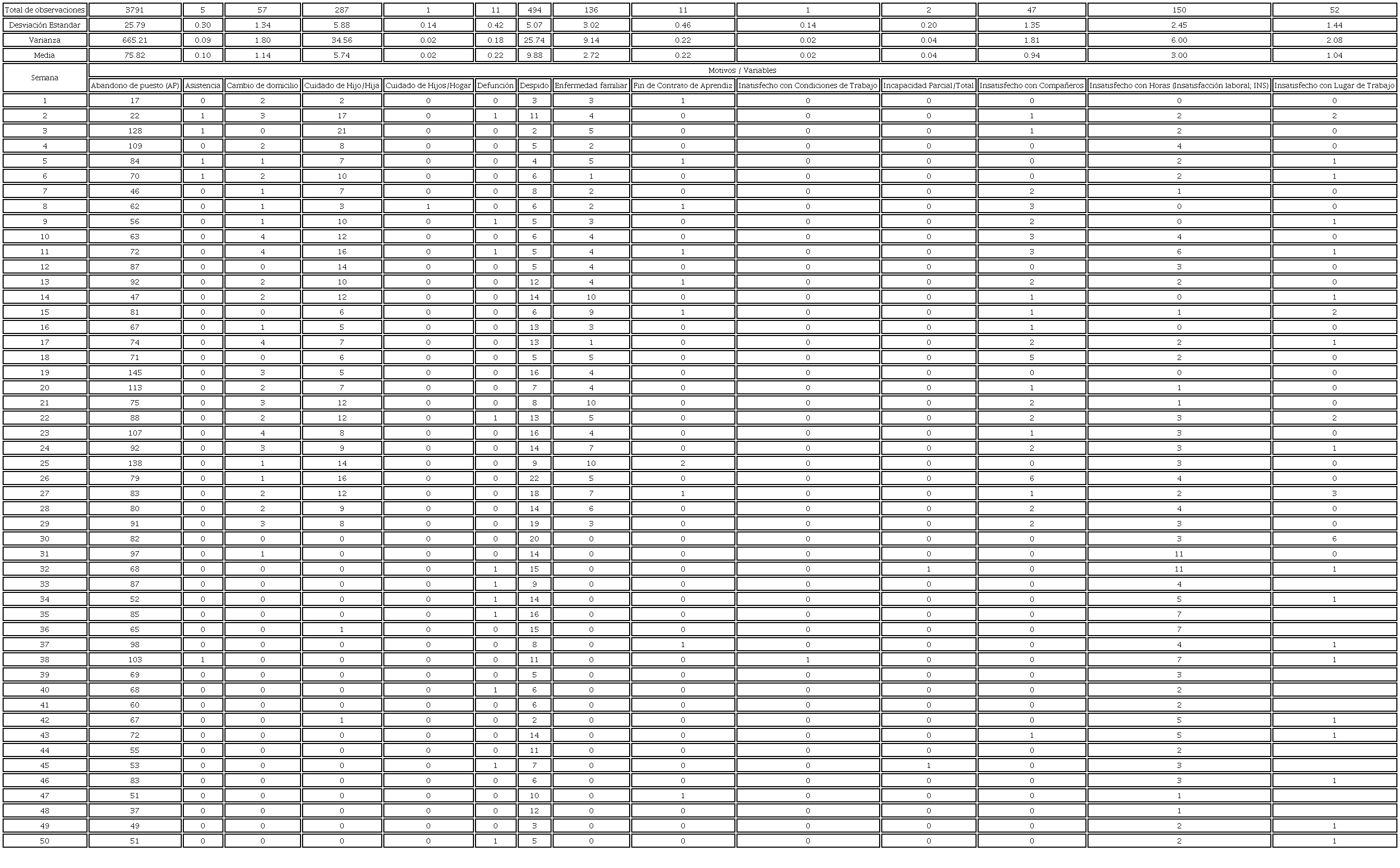 De acuerdo al análisis de salida proporcionado por empresa, se emplea la información del personal maquilador, desde el nivel de operario (auxiliar técnico, capturista, montacarguista, materialista) hasta los puestos de mando intermedios del proceso productivo (auditor, líder de grupo, entrenador), durante un periodo de 50 semanas correspondientes al año 2019, para identificar el nivel de correlación entre los factores generadores de ausentismo y el índice de rotación de personal en la maquiladora reynosense mediante la técnica de MC2E (véase Cuadro 1).