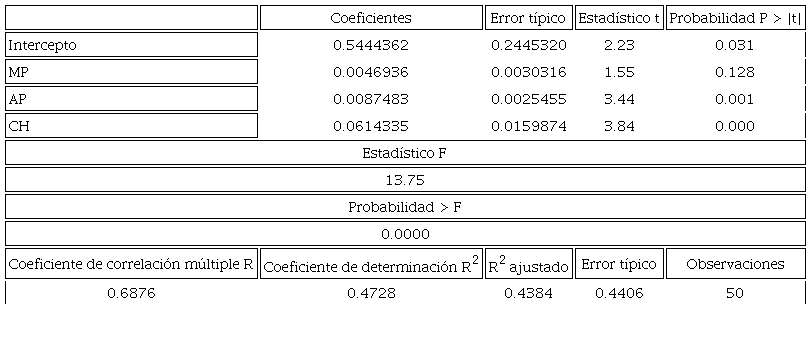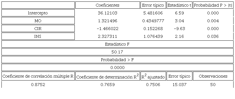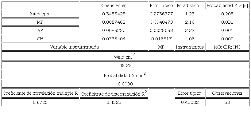 Por otra parte, la regresión de y2 sobre z1 , z2 y z3 se puede estimar mediante mínimos cuadrados ordinarios, obteniéndose los siguientes valores: y2~ = δ0~ + δ1~z1 + δ2~z2 + δ3~z3 + v. Se debe verificar que z2 y z3 sean estadísticamente significativos al 5 %; lo anterior corrige el problema de endogeneidad en y2 . Posteriormente, se utiliza y2~ como instrumento de y2 para realizar la regresión de y1 sobre y2~ y z1, a través del método de Mínimos Cuadrados Ordinarios (MCO): y1 = δ0 + δ1y2~ + δ2z1 + ὲ + δ1v. Donde el componente del error es ὲ + δ1v, el cual tiene media cero y no está correlacionado con y2~ ni con z1, así al realizar la regresión de y1 sobre y2~ y z1 los estimadores son eficientes (Wooldridge, 2010, 521-534)17.