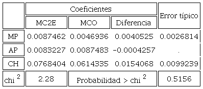 Ante la presencia de dos estimadores como MCO y MC2E, el segundo se asume más eficiente que el primero debido a su menor varianza, y se emplea la prueba de Hausman (1978) para calcular las diferencias comunes en las estimaciones de ambos modelos24. Si las diferencias no son sistemáticas, en términos de un sesgo definido (hipótesis nula; valor de p mayor a 0.05), ambos estimadores son consistentes ya que la estimación muestral tiende al parámetro poblacional, sin embargo, se prefiere el estimador asumido como más eficiente, en otras palabras, el estimador de MC2E.
