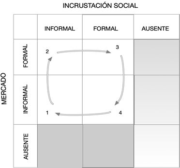 Segundo, los mercados institucionalizados o formales generan la necesidad de reincorporar a los informales y esta reincorporación se puede hacer bajo dos mecanismos: una reincorporación formal o vertical (auspiciada por el Estado) y otra reincorporación horizontal o informal (basada en instituciones sociales). El Estado mediante la integración vertical puede limitar la informalidad con regulaciones laborales o de otro tipo. Mientras que, en ausencia del Estado la reincorporación horizontal puede ocurrir basándose en instituciones sociales prexistentes o recién creadas que contrarrestan los riesgos de la mercantilización.
