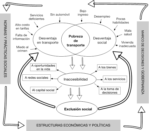Para Lucas (2012) existe una relación entre la exclusión social y el transporte en las sociedades humanas, derivado de tres tipos de factores causales: a) los relativos al individuo tales como la edad, la discapacidad, el género o la raza b) los relativos a la estructura de un área particular tales como, la falta o no disponibilidad o inadecuados servicios de transporte público o fallas en los servicios locales y c) los factores de la economía nacional y/o global como la reestructuración de los mercados de trabajo, las migraciones, influencias culturales y los marcos legislativos. Por su parte Hagen, Pardo y Valente (2016), consideran que el transporte juega un papel clave al determinar los beneficios sociales para diferentes sectores en las sociedades modernas en términos de la ausencia o de la falta de servicios de transporte adecuado y el impacto que éste tiene sobre los individuos o las comunidades.